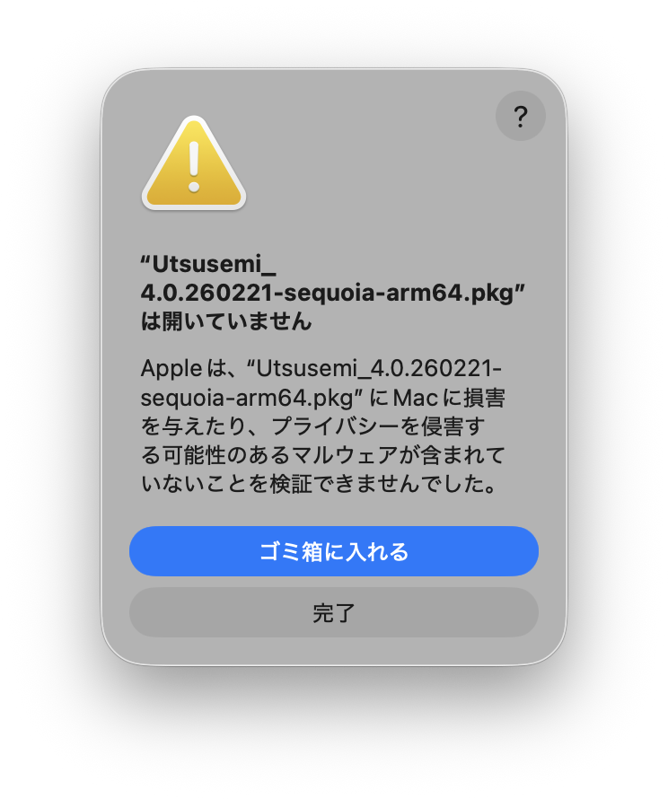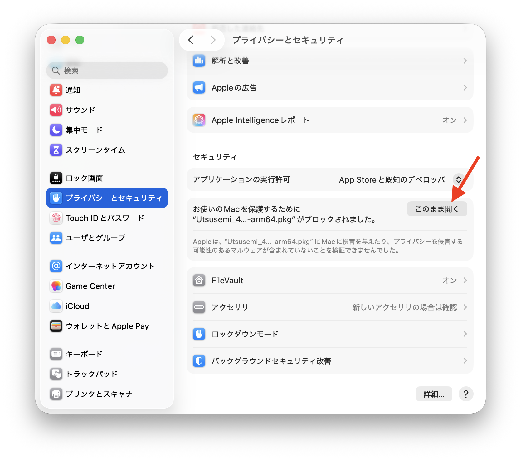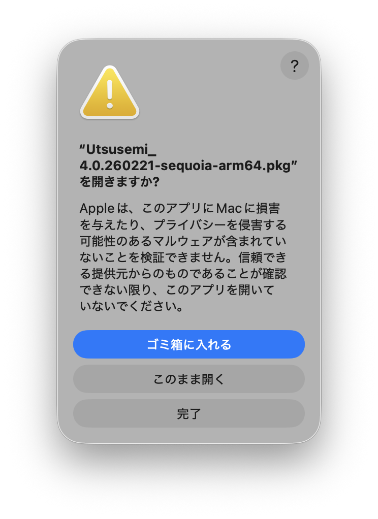 ダブルクリック直後に以下のようなダイアログが現れた場合はmacOSのセキュリティによってインストールの実行が阻害されている(macOS Tohoeにて確認)。そうでなければステップ3へ進む。以下のダイアログが出た場合「システム設定」を起動し、「プライベートとセキュリティ」→「お使いのMacを保護するために・・・」→「このまま開く」をクリックする。この状態で再びインストーラをダブルクリックすると、先ほどのダイアログで、「このまま開く」のボタンが増えるので、それをクリックする。