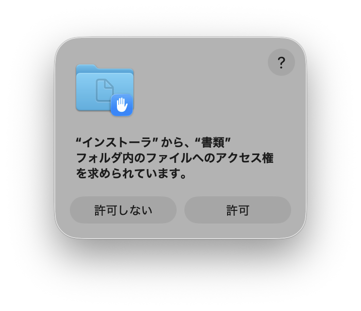 インストール中に下記のような確認ダイアログが出た場合(macOS Tohoeにて確認)、「許可」ボタンを押す。